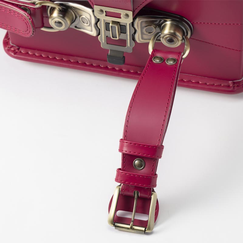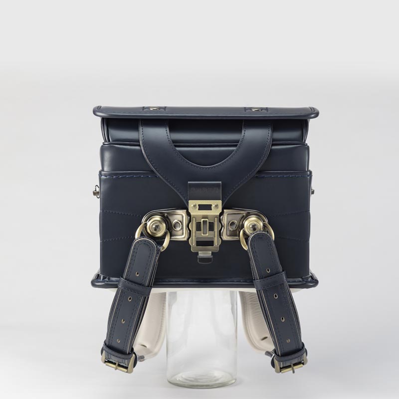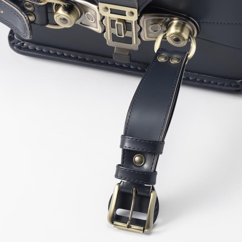 金具類はアンティーク調のブロンズ仕上げ。リフトハンドルと肩ベルトのリフレクター(反射材)は、控えめながらも、交通安全の機能をしっかり発揮します。